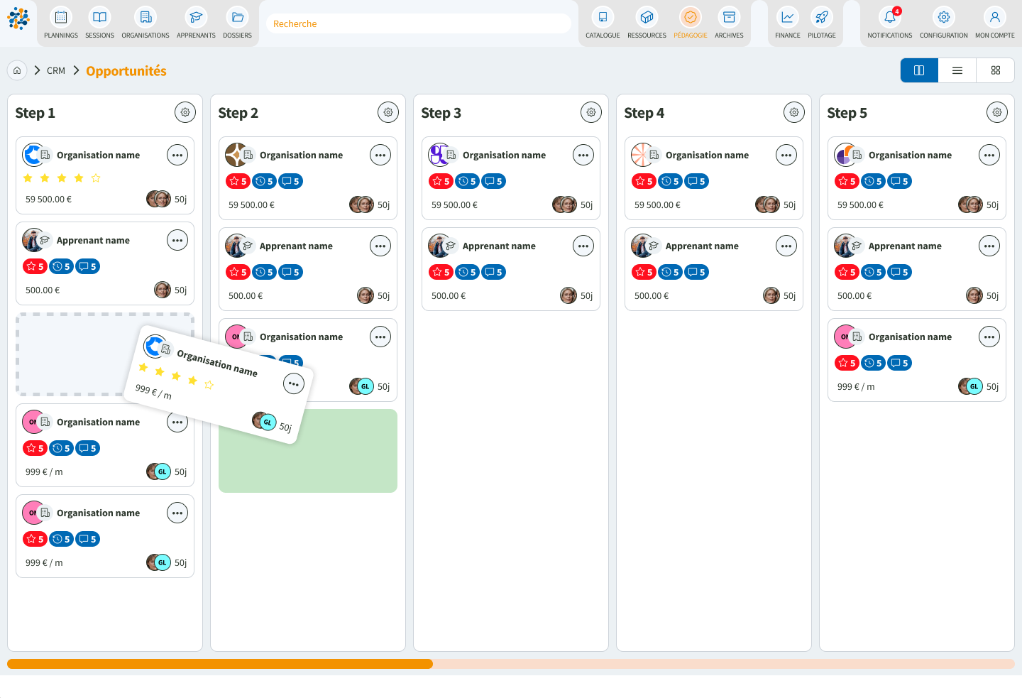 - Faites avancer vos affaires dans vos cycles afin de conclure vos affaires. Par simple cliqué/glissé ou de manière automatisée, vos prospects et clients avanceront dans vos cycles de vente.